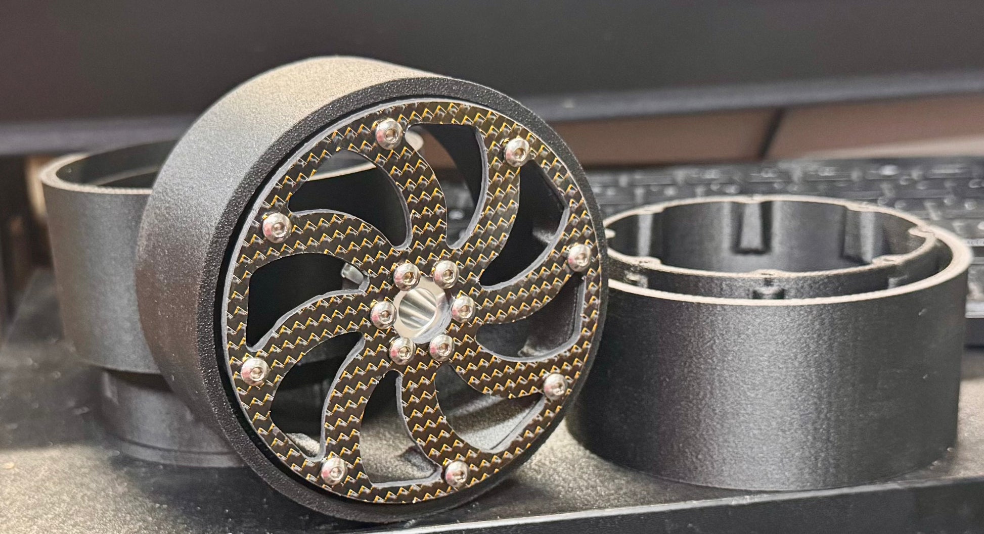 2.9 wheel, this is a 3-D printed ( pa6-CF) barrel and inner ring, paired with a 2mm thick carbon fiber face.